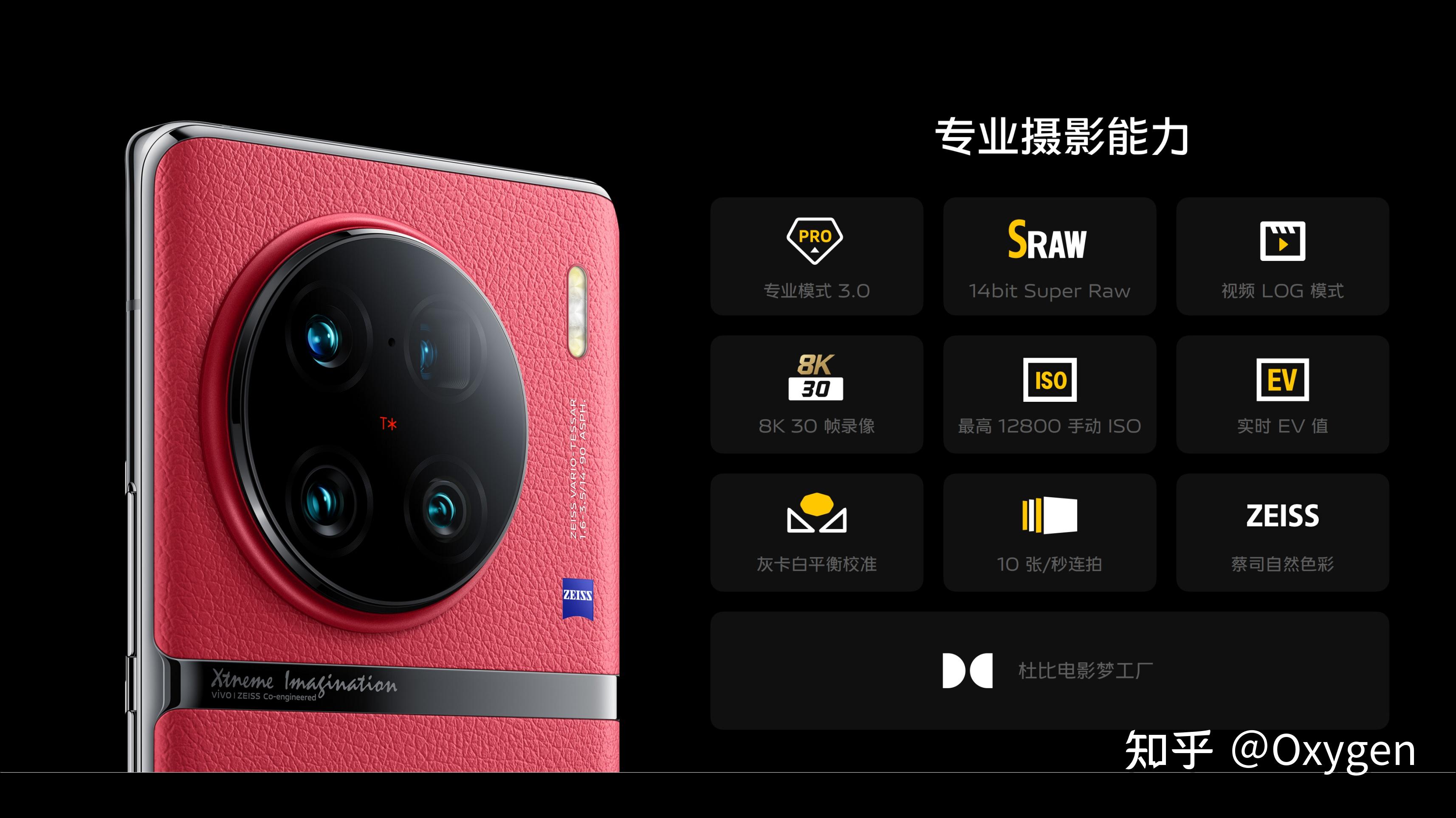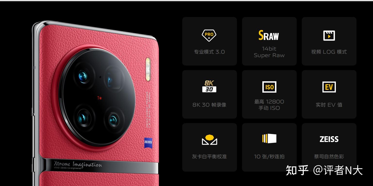但也往往是越简练的形态,越需要成熟克制的 CMF 来配合。vivo X90 的华夏红是我最喜欢的配色。荔枝纹素皮表面分布粒面软格,与陶瓷质感的 choker 形成色彩和材质的对比,很好地互相衬托出了双方的特点。这样的撞色方案,起到了「1+1=2.5」的效果。